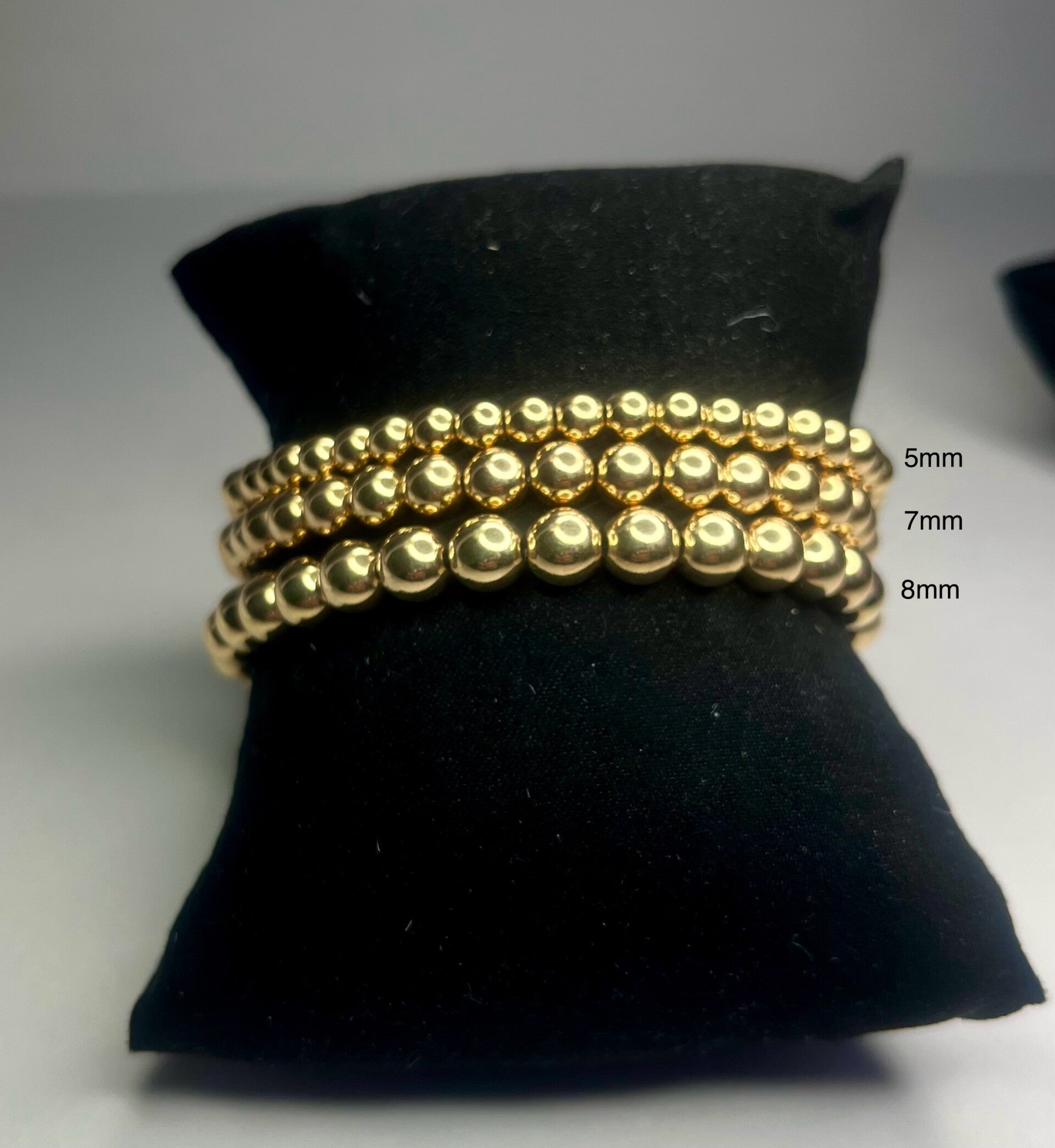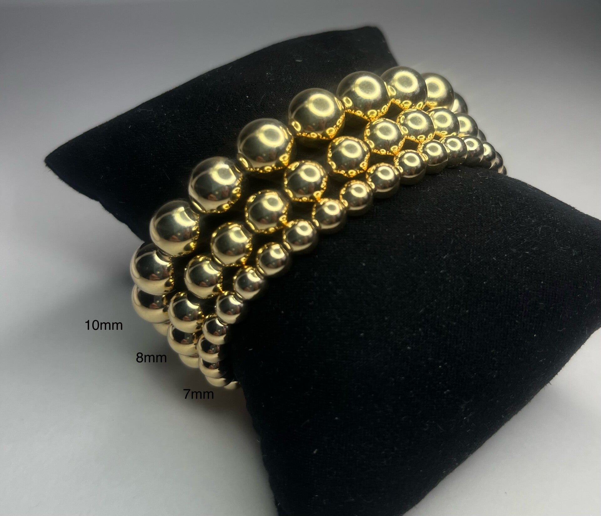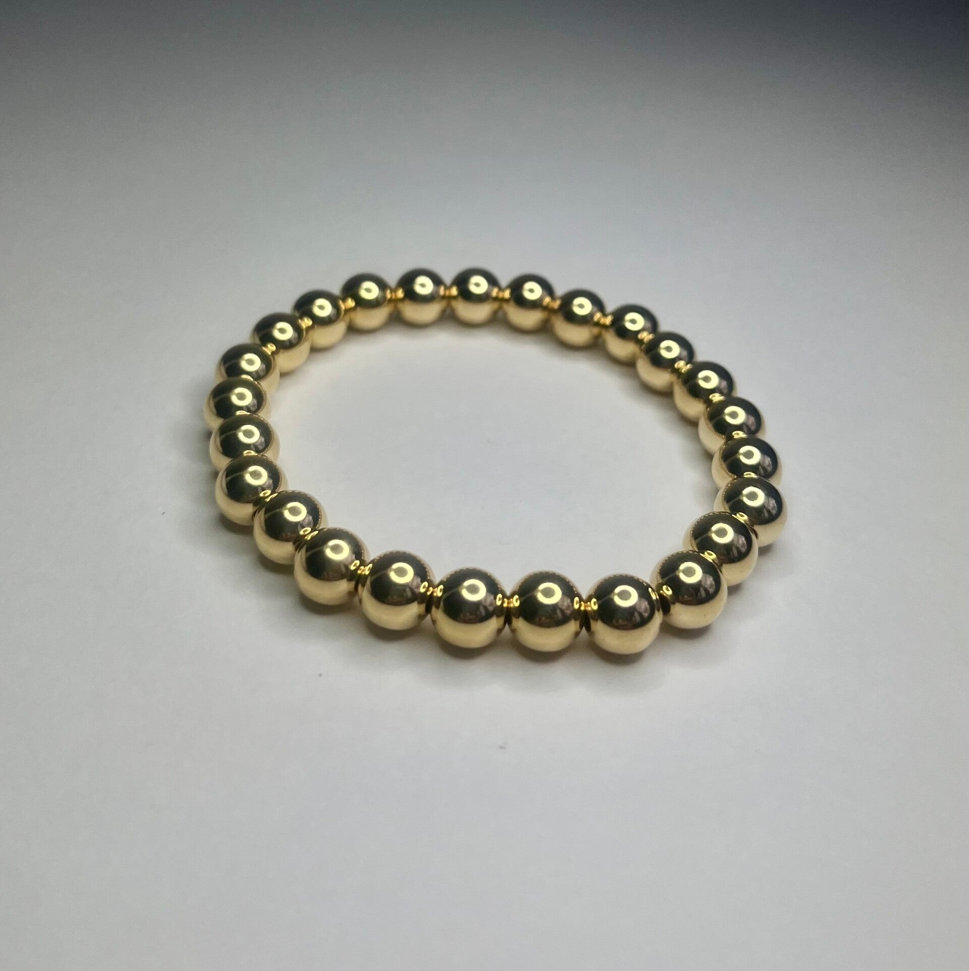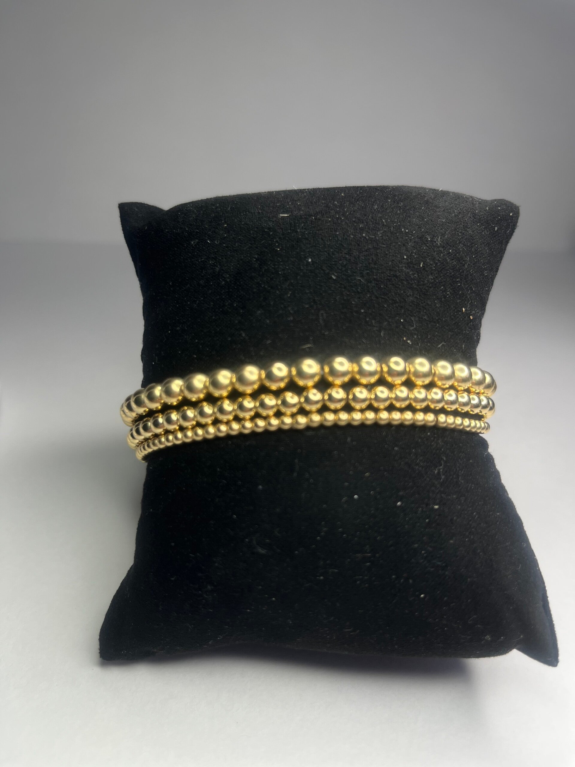Elastiche armband met goudkleurige balletjes.