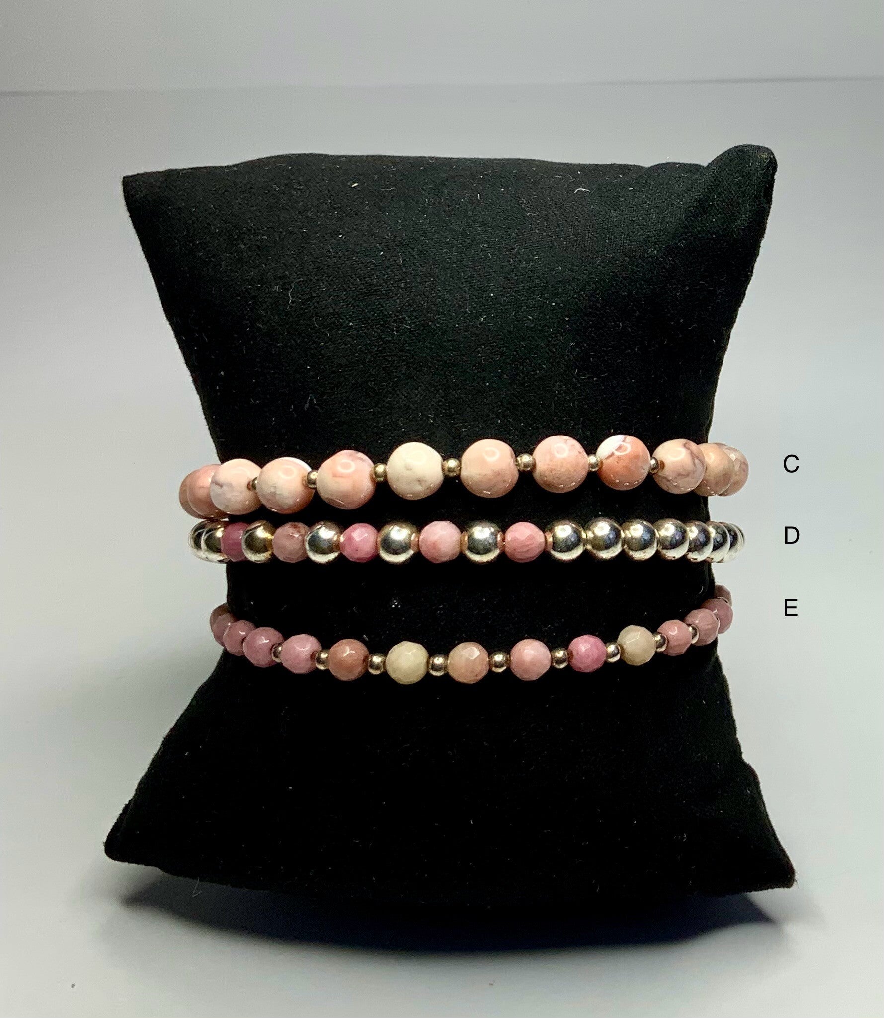 Pink C is een elastische armband met Rhodoniet om en om met 2,5mm zilveren kraaltjes.